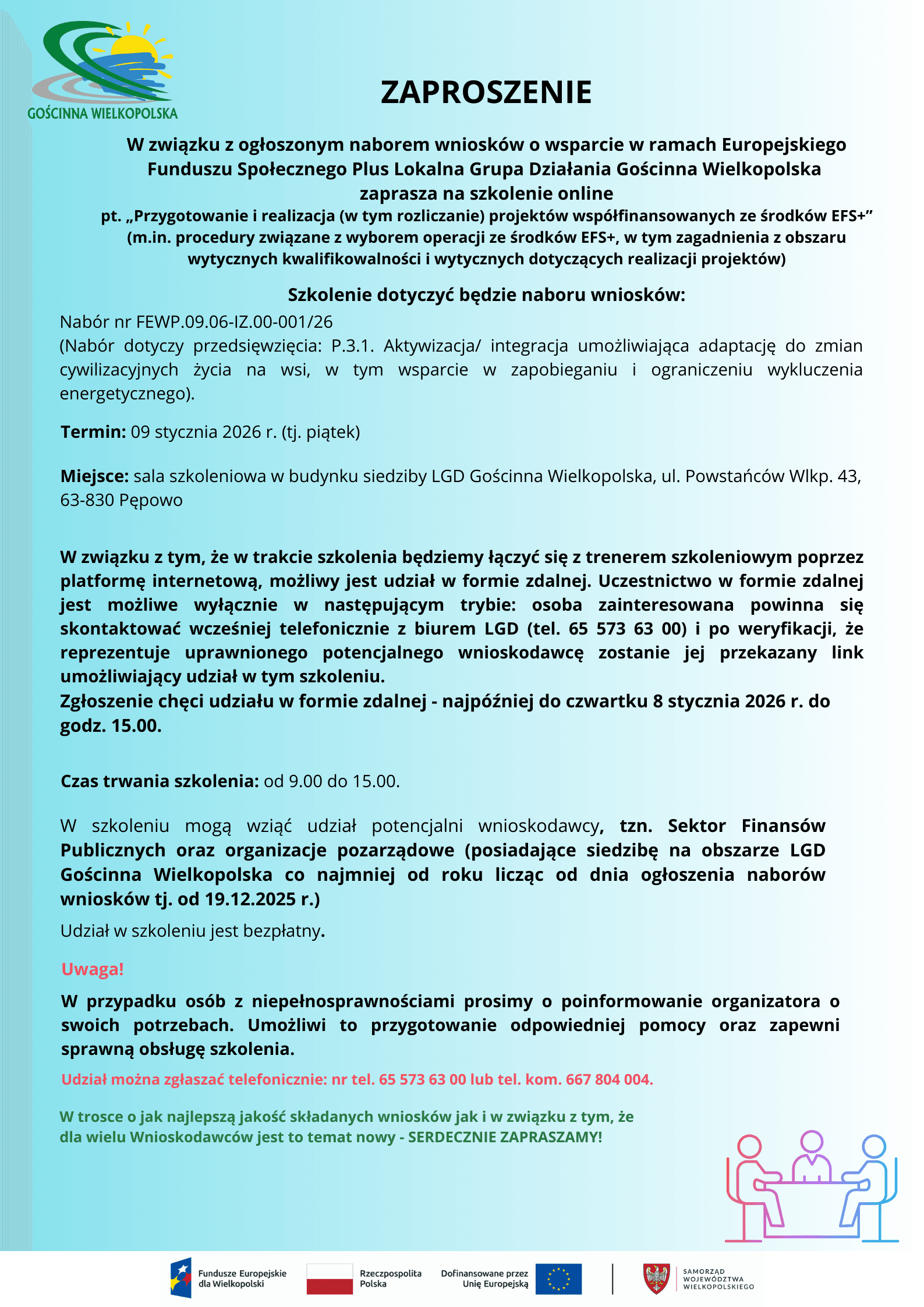 Plakat informuje o szkoleniu dla potencjalnych wnioskodawców w zakresie „Przygotowanie i realizacja (w tym rozliczanie) projektów współfinansowanych ze środków EFS+”. U góry plakatu znajduje się logo LGD Gościnna Wielkopolska. Poniżej znajdują się szczegóły szkolenia. Szkolenie dotyczy dwóch naborów wniosków: Nabór nr FEWP.09.06-IZ.00-001/26, związany z aktywizacją i integracją, umożliwiającą adaptację do zmian cywilizacyjnych na wsi, oraz wsparciem w zapobieganiu wykluczeniu energetycznemu Szkolenie odbędzie się 9 stycznia 2026 r. w godzinach 09:00-15:00 w sali szkoleniowej w siedzibie LGD Gościnna Wielkopolska w Pępowie. Potencjalni wnioskodawcy, czyli przedstawiciele Sektora Finansów Publicznych i organizacji pozarządowych z terenu LGD Gościnna Wielkopolska co najmniej od roku licząc od dnia ogłoszenia naborów wniosków tj. od 19.12.2025 r., mogą wziąć udział w szkoleniu. Szkolenie jest bezpłatne Istnieje możliwość uczestnictwa zdalnego. Aby wziąć udział w szkoleniu zdalnie, należy skontaktować się telefonicznie z biurem LGD pod numerem 65 573 63 00 do 8 stycznia 2026 r. do godz. 15:00. Po weryfikacji zostanie przesłany link do szkolenia. Osoby z niepełnosprawnościami proszone są o wcześniejsze poinformowanie organizatora o swoich potrzebach, aby umożliwić przygotowanie odpowiedniej pomocy Zgłoszenia udziału w szkoleniu przyjmowane są telefonicznie pod numerami 65 573 63 00 lub 667 804 004. Na dole plakatu znajdują się logotypy: Fundusze Europejskie dla Wielkopolski, Rzeczpospolita Polska, Dofinansowane przez Unię Europejską oraz herb Województwa Wielkopolskiego.